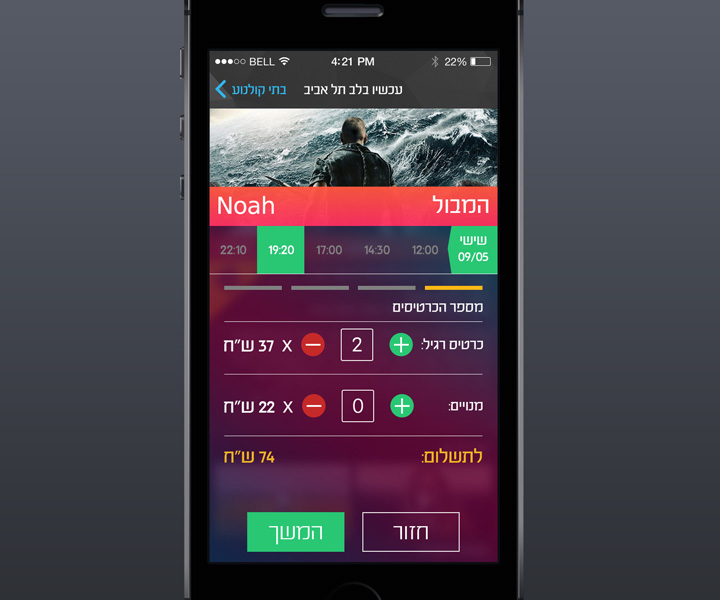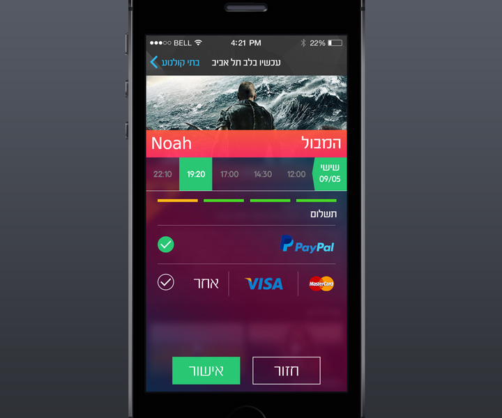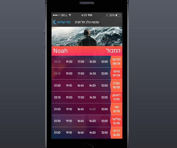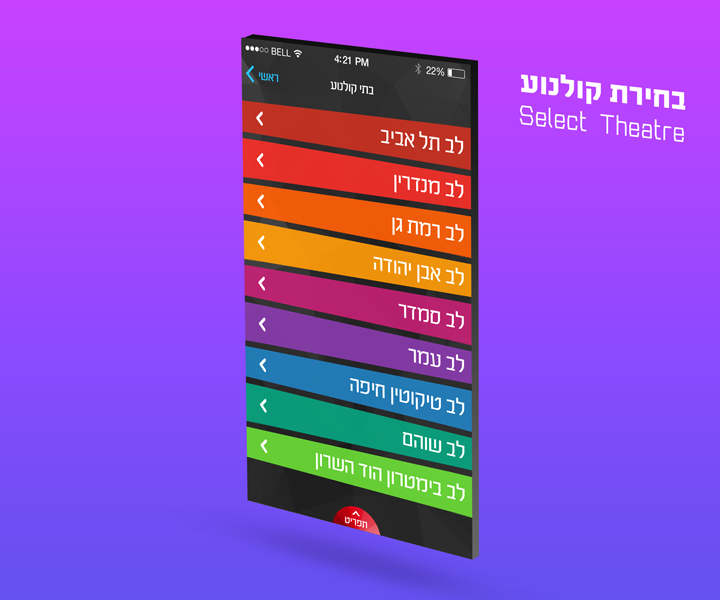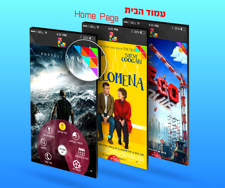עמוןד בית עם קרוסלה של 5 סרטים חדשים. מטרת המשולשים הצבעוניים בפינה המנית העליונה היא להציג באילו בתי קולנוע מקרן כל סרט. לכל סניף יש צבע משלו אשר רק אותו עם הזמן והשימוש באפליקציה יוכל לזכור המשתמש הגר באותו אזור.